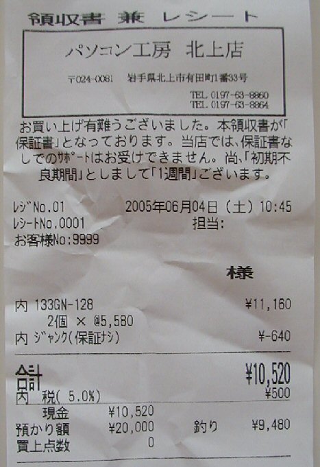 メモリはノーブランド128MBが¥5580円/個、いらなくなったメモリ64MBは買い取ってもらって¥320円/個、工賃¥1500円はまけてくれた。