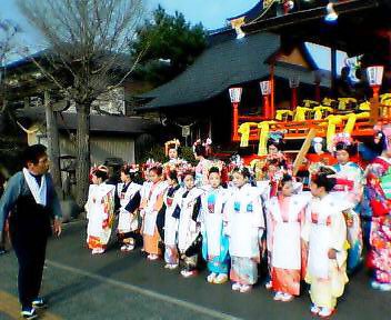 年中、年少組は、火の用心の半纏をはおって、後に続いて行列します。